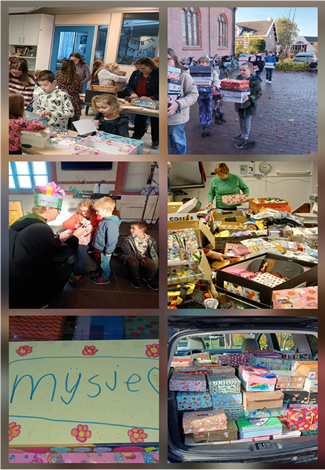 ![]() Wat was het weer een groot succes deze actie! Weer geweldig wat alle mensen geven om de dozen te vullen, van zelf gebreide sjaals, genaaide en gevulde knikkerzakken, rondgestruind in de kringloopwinkels, bijdrages in envelopjes en collecte, al de kinderen die enthousiast de dozen versieren samen met de helpers, de dames die de dozen vullen met alle spullen. Dit heeft als prachtig resultaat gehad dat we samen met de Hervormde Kerk Kapelle, Basisschool de Linge en Basisschool het Honk en ook van de Moolhoek een mooi aantal van 245 volle kleurrijke dozen gebracht naar het depot in Yerseke. | ||
